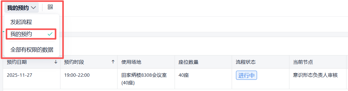 申请人可在预约申请页面的左上角“发起流程”下拉菜单中选择“我的预约”,实时查看预约记录与审批状态。