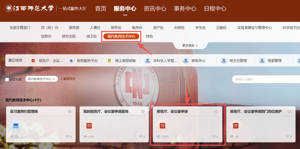 请登录学校“一站式服务大厅”,于页面上方导航栏进入“服务中心”页面,选择主管部门“现代教育技术中心”,点击“报告厅、会议室申请”模块,即可进入预约申请页面。